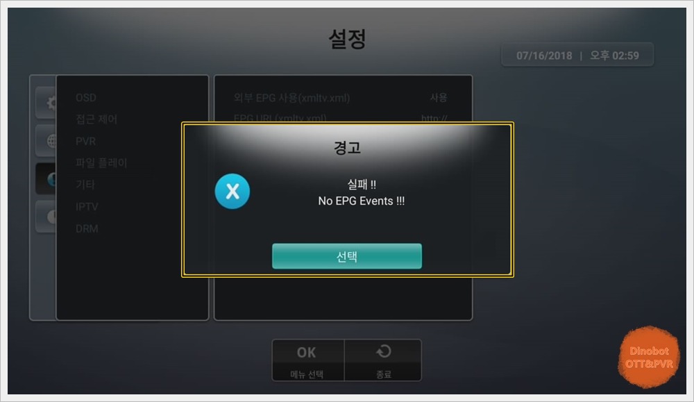 EPG 데이터를 불러 올 수 없으면 ' 경고 ' 창이 표시 됩니다.