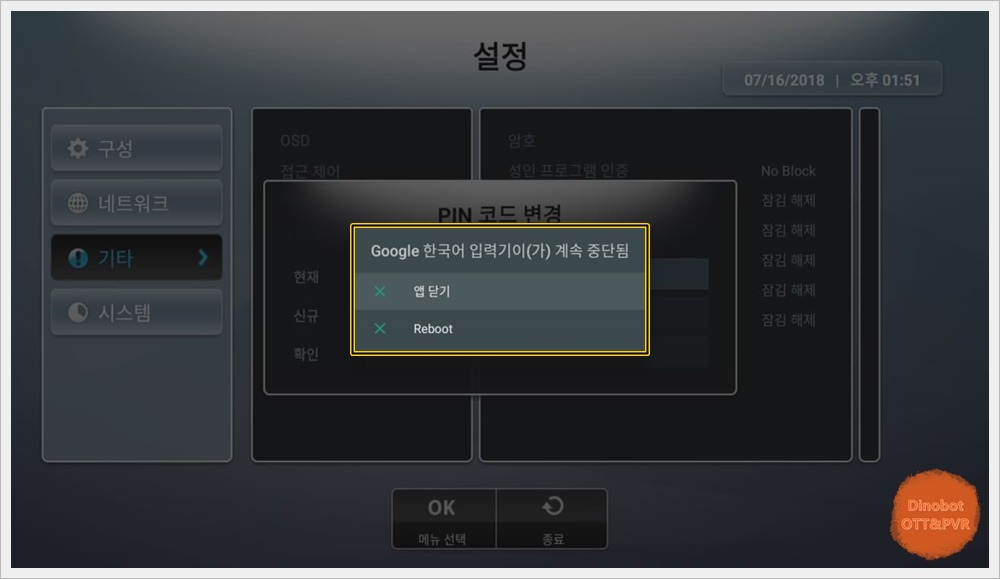 ' PIN 코드 변경 ' 창이 뜨면서 ' 구글 한국어 입력기 ' 오류가 나타납니다.