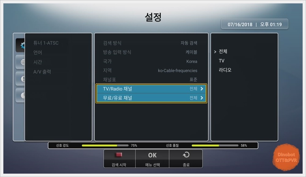 ' TV/Radio 채널 ' 과 ' 무료/유료 채널 ' 설정은 필요하신 대로 설정 하시면 됩니다.