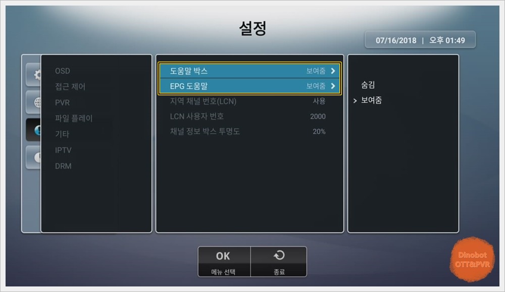 ' 도움말 박스 ' 와 ' EPG 도움말 ' 설정은 사용에 헛깔리지 않도록 ' 보여줌 ' 으로 사용하심이 좋습니다.