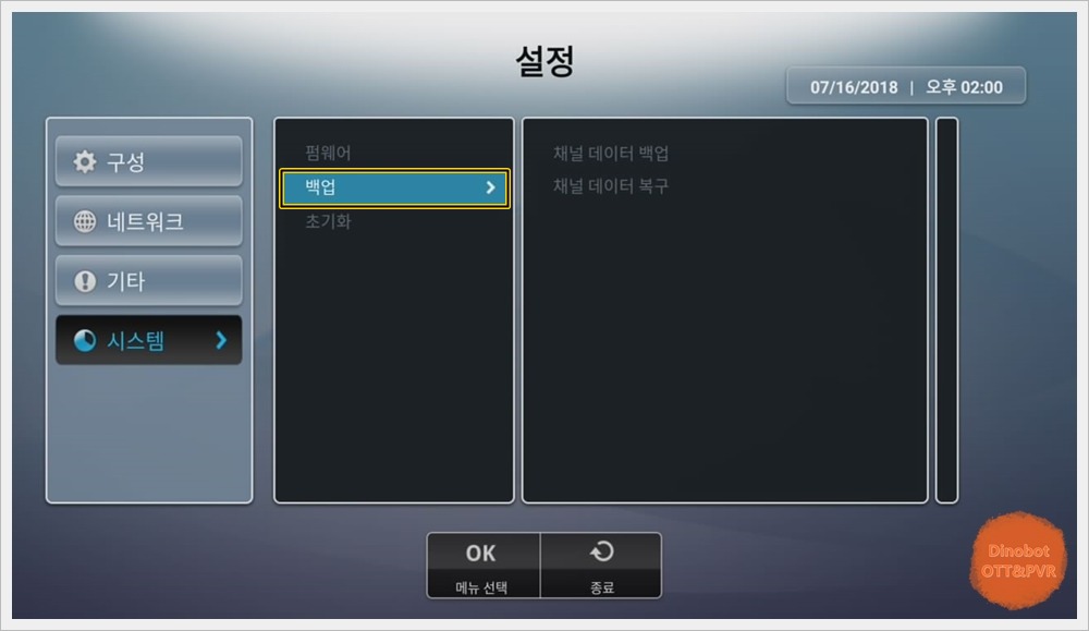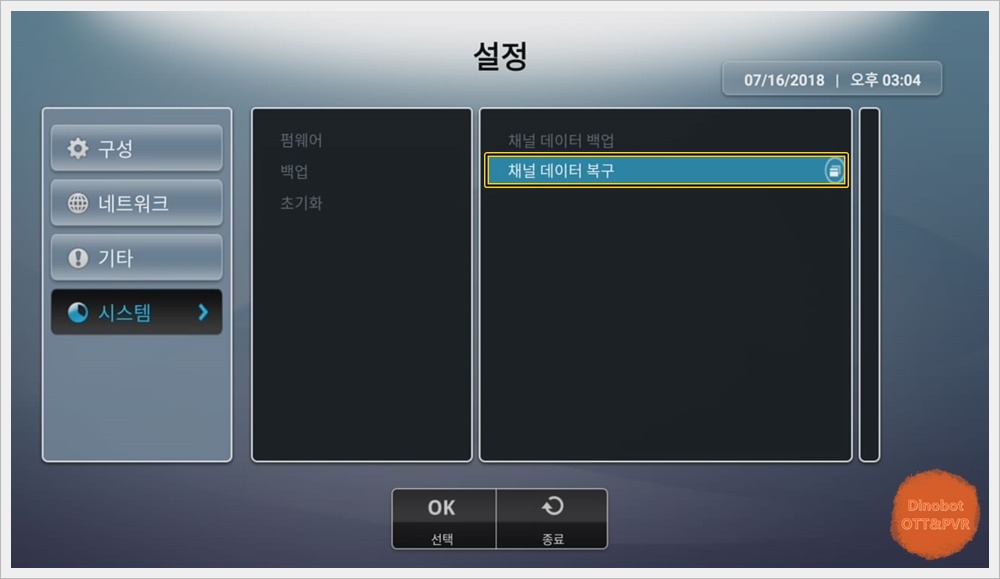 ' 시스템 ' 설정을 통해서 채널 데이터 백업과 복구가 가능 합니다.