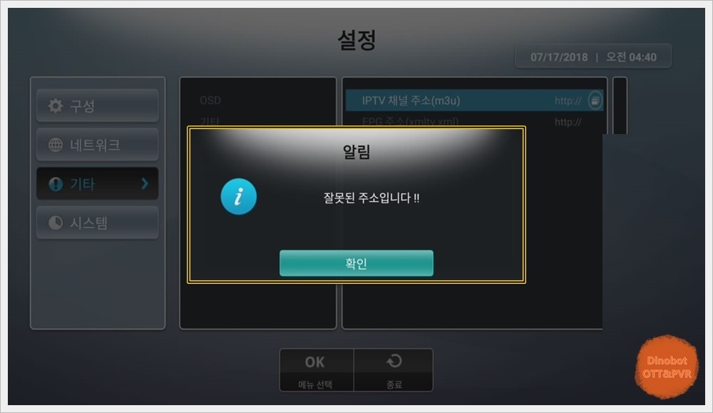 IPTV 수신 데이터를 불러 올 수 없으면 ' 알림 ' 창이 표시 됩니다.
