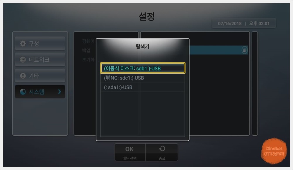 채널 백업 데이터가 들어 있는 할 USB 저장장치를 선택하면 채널 데이터 복구가 가능 합니다.
