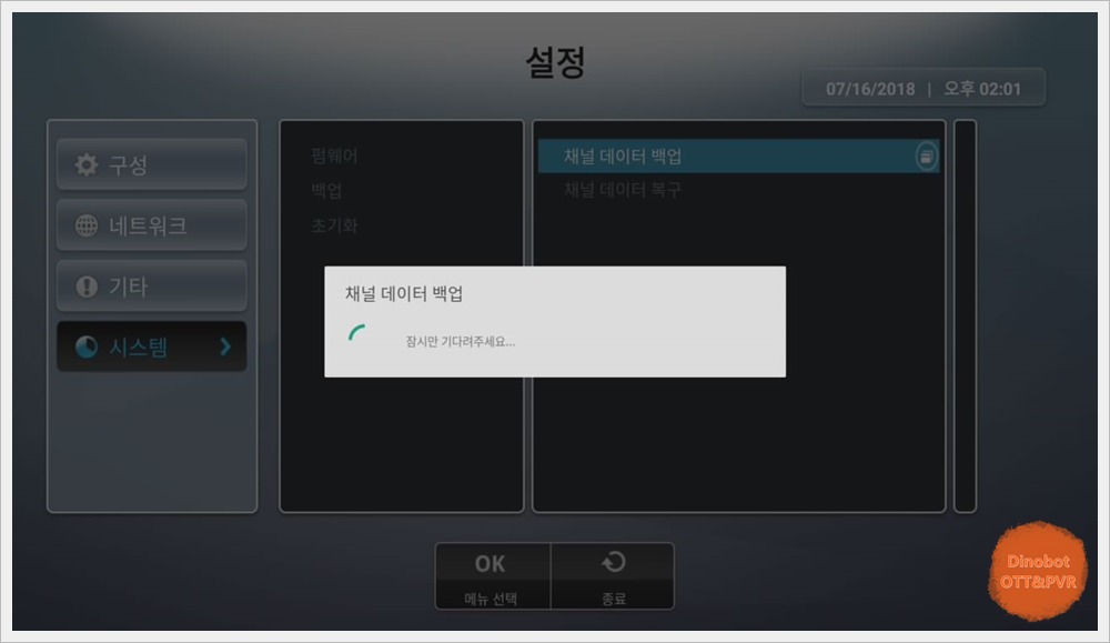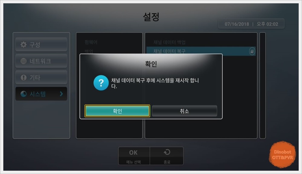 ' 확인 ' 을 누르면 채널 복구 작업을 시작 하며 채널 데이터 복구 후에는 시스템이 재시작 됩니다.