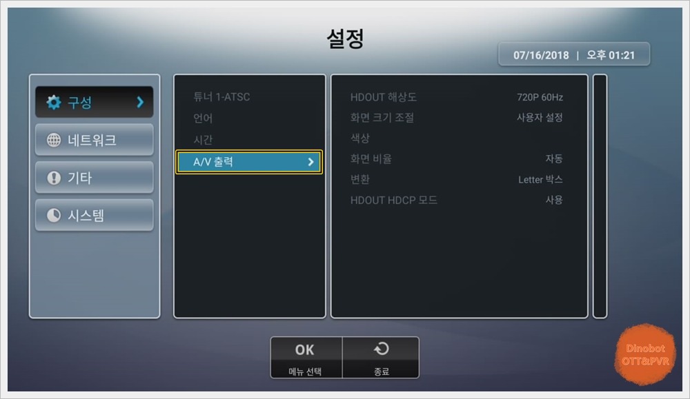 ' A/V 출력 ' 설정은 화면 출력에 관한 설정 입니다.