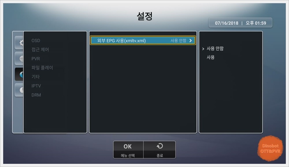 ' IPTV ' 설정을 통해서 외부 EPG와 IPTV M3U 파일 설정이 가능 합니다.