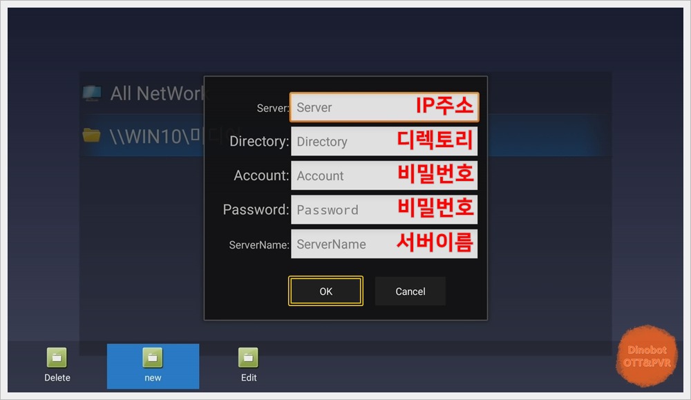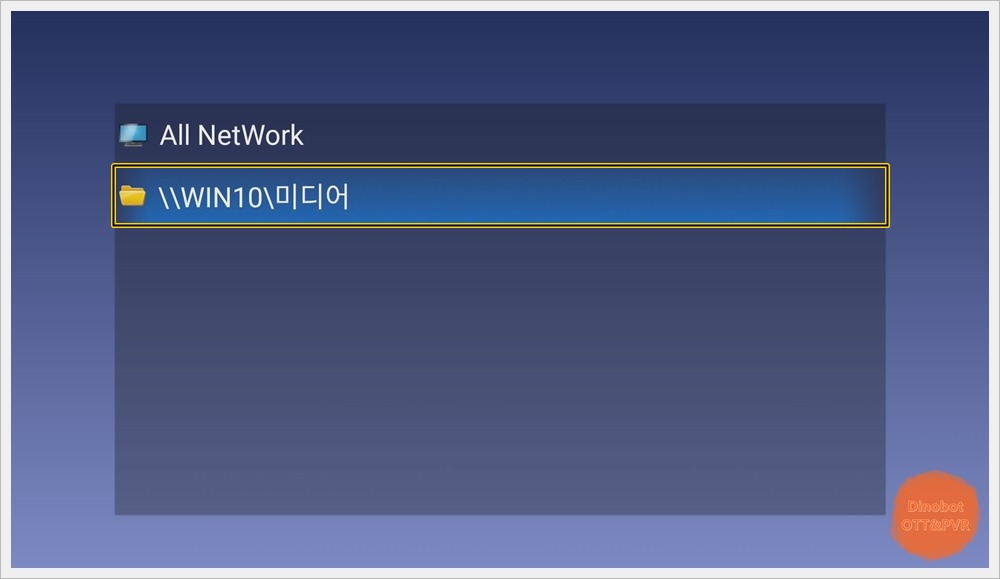 자동으로 SMB 서버 연결이 안 될 경우에는 ' All NetWork ' 에서 리모컨 ' 메뉴 ' 버튼을 누르신 후에 ' new ' 버튼을 누르면 수동으로 서버 연결 설정이 가능 합니다.