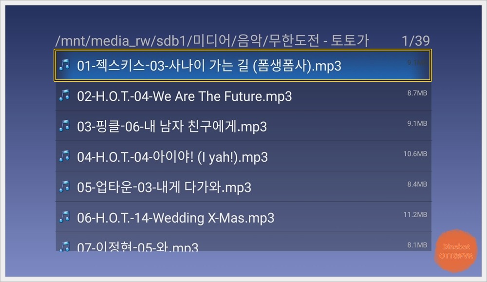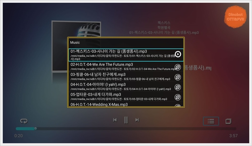파일 목록 확인 버튼을 누르면 폴더 안에 파일 목록 확인이 가능하며 다른 파일로 변경 재생이 가능 합니다.