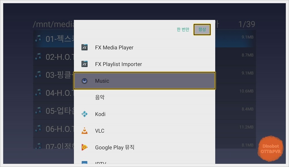 ' Music ' 를 선택하고 ' 항상 ' 을 눌러주세요.